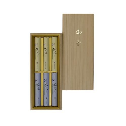 微煙タイプと超微煙タイプの二種類を詰めたお線香のセットです。 香り:清閑で上品なイメージのフローラルな香り。 長さ:135mm(一般的な長さ) 煙の量:かなり少ない(黄色)、ほとんどない(青色)