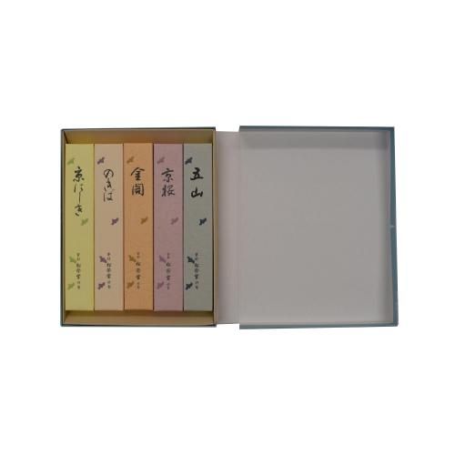 【香老舗 松栄堂】 京都の有名お線香メーカーの信頼あるトップブランドのご進物用お線香です。「京線香」シリーズから5種類のお線香を、ご進物向けに紙箱に詰合せました。処分の際のご負担を軽減し、環境にもやさしい贈りものとしてもお薦め致します。