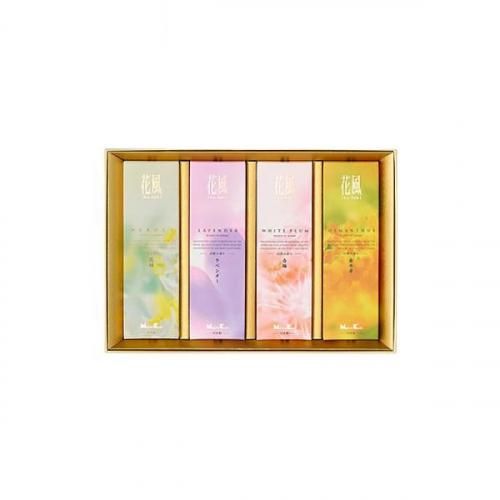透明感のあるかぐわしい4種の花の香りを紙箱に詰め合わせました。処分の際のご負担を軽減し、環境にもやさしい贈りものとしてもお薦め致します。 香り:[花橘] 花橘の爽やかで明るいシトラスフローラルの香り。 [ラベンダー] 最も芳香がすばらしい開花直前のラベンダーそのものの香り。 [白梅] 春を待つ白梅そのものの香り。 [金木犀] 金木犀にアプリコットやジャスミンを溶け込ませた香り。 長さ:140mm(短寸・一般的な長さ) 煙の量:かなり少ない
