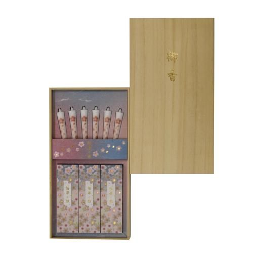 桜柄のローソクと老木桜をイメージしたお線香を桐箱に詰め合わせました。桐箱は格式を感じさせ、また湿気を吸ってくれるためお線香の保存にも適しております。